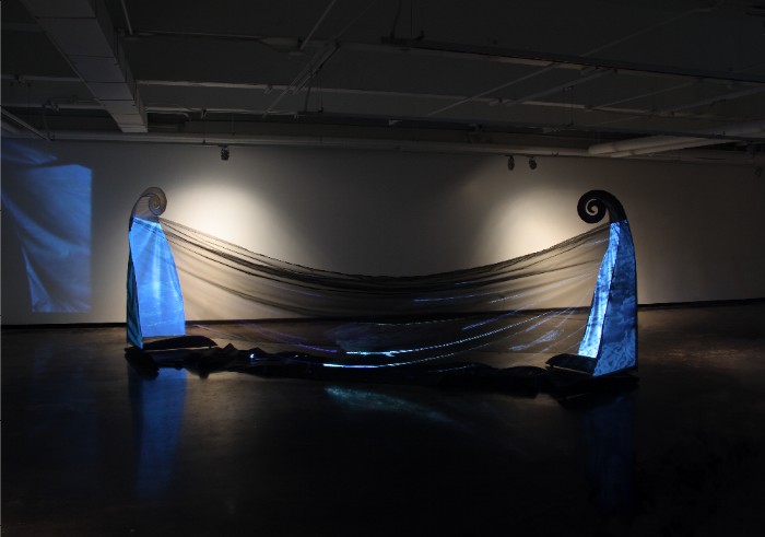 Fram and Oseberg and Farther North of Everywhere Fabric, Vinyl, Wood, Video, Sound Approximately 18’l x 4’w 6’h ©2011
